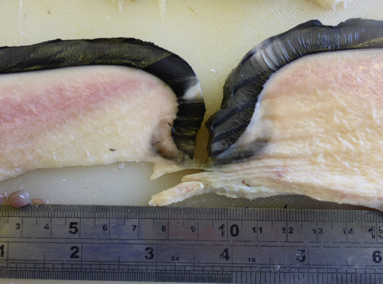 This case highlighted the grim realities of entanglement in large baleen whales, such as changes in behaviour and disruptions in energy budgets. Once the whale had become entangled, it would have had to spend much more energy dragging the ropes and any attached gear with it through the water. The rope was stretched tight over the back just behind the head, which probably prevented the animal from feeding normally. As a result the whale was in poor body condition making it more susceptible to the effects of infection and parasitism, which debilitated it further. The animal had a very high parasite burden in the intestine and eventually drowned, either through sheer exhaustion or as a result of becoming entangled further.
