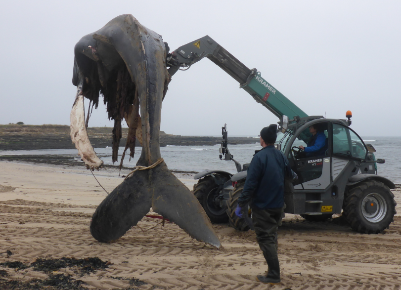 With the help of Dunbar RNLI crew, East Lothian Countryside Rangers, the Civil Nuclear Constabulary and local farmers, the whale carcass was moved to allow the Scottish Marine Animal Stranding Scheme team (SMASS, www.strandings.org) to perform a necropsy the following morning. The necropsy concluded that this whale had suffered a chronic entanglement. This means the animal had been dragging the entangling ropes for a prolonged period of time, and these lines had cut deep into the blubber layer causing scarring in the underlying tissues, in particular around the pectoral fin where this had caused a severe infection.
