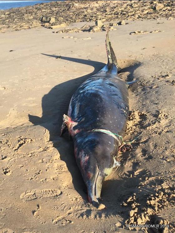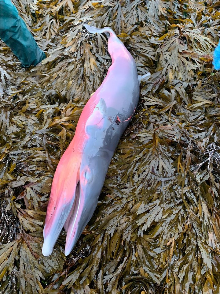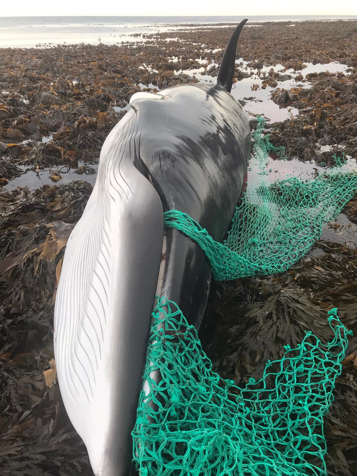 A reminder of the hazards of ghost gear, this section of net was likely torn away from active gear or discarded- an adult female minke whale in otherwise good health, likely live stranded after becoming entangled in section of net; The mid-term foetus was, sadly, like the dam in apparently healthy condition.