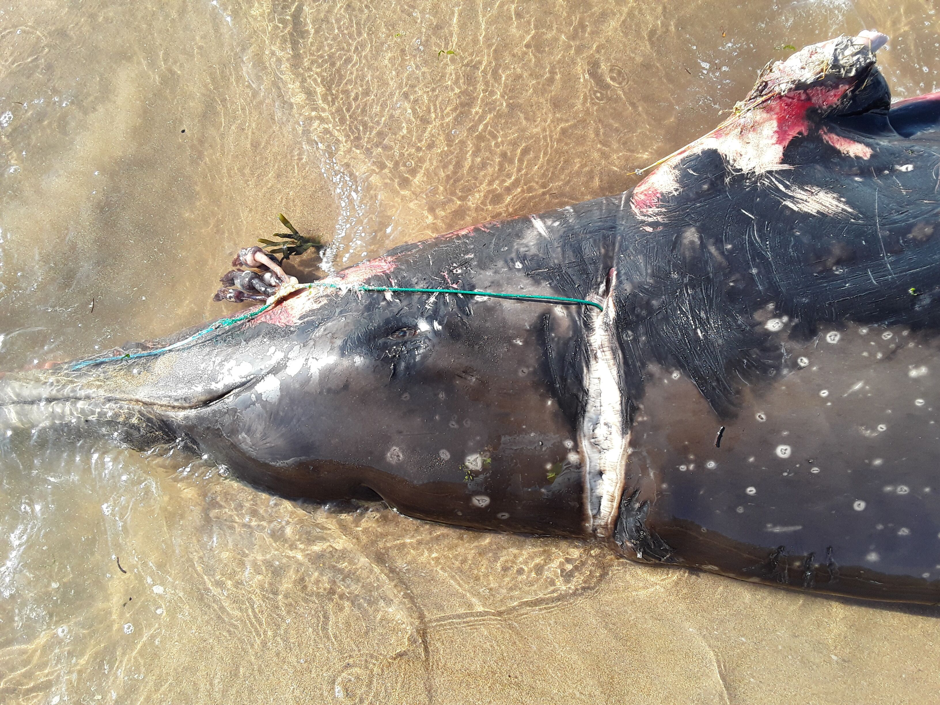 The animal was in thin body condition and showed severe trauma to the right pectoral fin, large areas of skin loss from the flank, and a loop of thin, green cord embedded around its neck. It had been entangled for long enough that the cord had worked its way right through the skin and blubber layer into the underlying muscle layer. In some places the skin had actually grown over the top of the rope; in others it had set up a deep tissue infection and abscessation. There were goose barnacles attached to the rope, an indication that the entanglement had considerably compromised the swimming capabilities of the animal. Based on the depth of the tissue trauma and the damage to the flank, it is highly likely this loop around the neck had at some point been attached to longer and heavier material. Miraculously, in this state the animal had still been able to feed, although not much and not recently. At some point over the last few days, it appears the rope somehow became wrapped around the pectoral fin, dislocating the shoulder joint and severing the pectoral fin. Unable to swim effectively, and most likely in a large amount of pain, the animal live stranded and died.