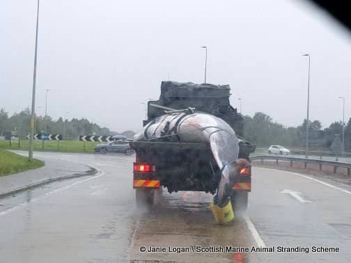 If you heard rumours about a large whale being transported through Inverness last week; they are all true. And most of it even fitted on a lorry…On Tuesday evening (18th September) a minke whale was observed live stranding in Ardersier Bay near Inverness. Despite the best efforts of a number of British Diver’s Marine Life Rescue (BDMLR) volunteers and the Coast Guard, the whale died not long after coming onto the beach. Due to the lack of daylight the carcase was secured for access and post mortem examination the following day.