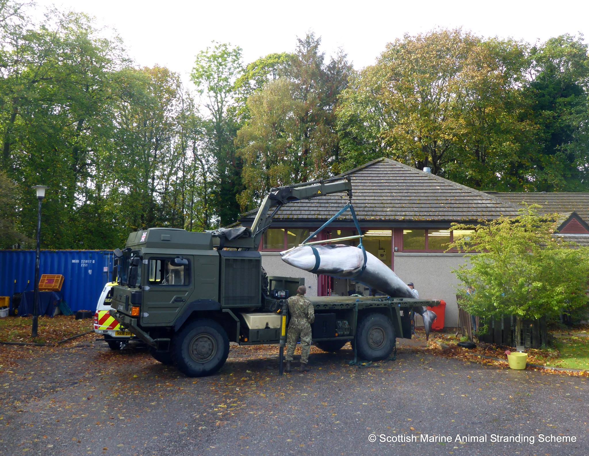 Given the size of the animal, and hence the obvious issues with taking it anywhere, the initial thought was we would have to do the necropsy on-site at Ardersier bay. However, with a storm brewing and a forecast featuring gale force winds and horizontal hail, we rapidly explored options for transporting the animal to our lab in Inverness. Post-mortems in controlled lab conditions enable much more thorough investigations, better samples and generally happier pathologists, and hence was much the preferred option to find out why this thin minke had live stranded. Nevertheless the animal was 644cm long and weighed an estimated 2000kg; not an easy thing to shift! With the weather rapidly worsening we needed a solution quickly, and it was with great help of a local farmer that the carcase was moved off the beach, where the guys of the 3rd Battalion Royal Regiment of Scotland were waiting with their well-equipped high up truck. Having a 644cm minke whale on a 500cm truck does however mean that a noticeable bit of your whale dangles off the back; so it was quite a sight driving through the capital of the Highlands.