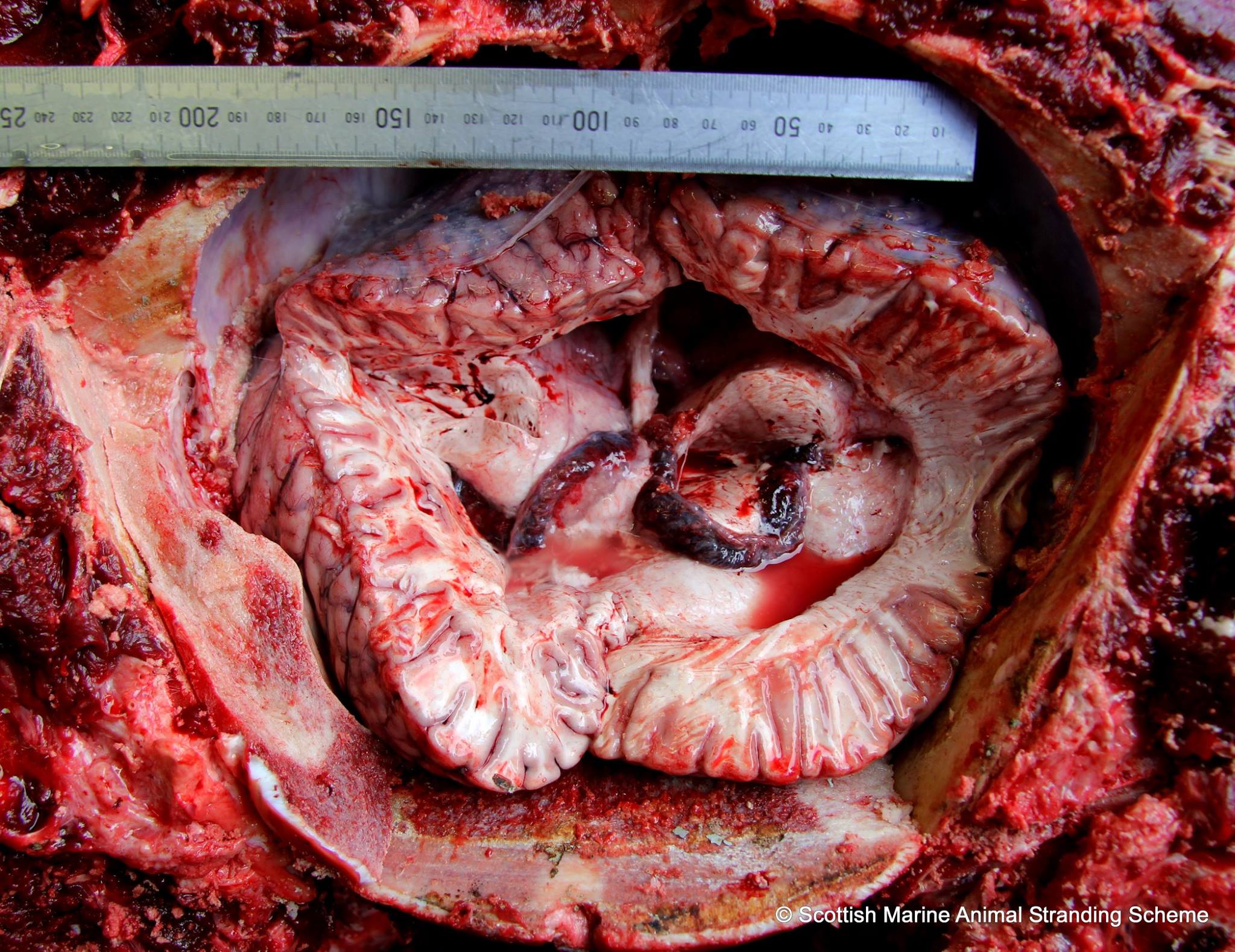 So with great thanks to the Army, we managed to get the minke to our lab for post mortem within 18 hours of death. The sub-adult female was very debilitated, had a thin blubber layer and had not recently fed, and showed pathology consistent with live stranding and agonal water aspiration. The most significant findings however were the severe lesions in the brain, characterised by an excess amount of cerebrospinal fluid (CSF) and profoundly dilated cerebral ventricles. There were diffuse meningeal adhesions, most severe around the brainstem, and purulent foci in the frontal cortex. These observations are consistent with a meningoencephalitis due to a bacterial infection, and further bacteriological and histopathological examination is currently underway to establish the pathogen responsible for the infection. It is almost certain the cognitive ability of this animal was severely compromised as a result of these lesions, impairing the ability to forage and, ultimately, leading to the animal live stranding and drowning.