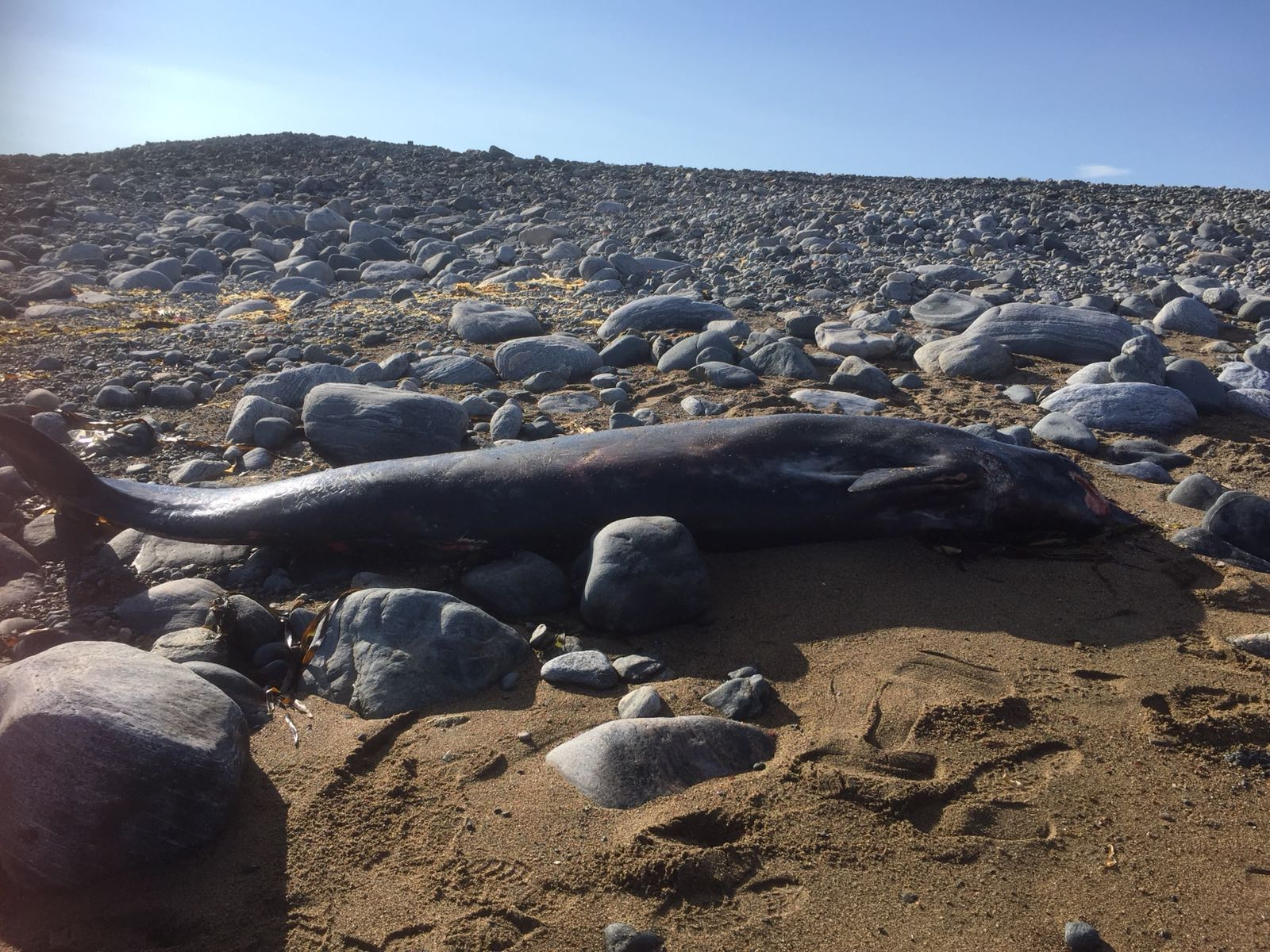 After all that, the actual post-mortem was a comparative piece of cake, and between us Mariel and I collected the measurement tissues and samples we sought. It wasn’t in great condition, hadn’t fed recently but, apart from the damage brought about by stranding, there wasn’t much in the body of the animal to indicate why it stranded. By this time however, the tide was on the turn and there was a ferry to catch, so, like some Victorian trophy hunter, I removed the head, balanced it on my shoulder and headed back to shore, to Stornoway and home.