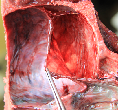 The following day, in the wind and surf free environment of our laboratory in Inverness, we were able to examine the brain and found the reason for the stranding. In the middle of the brain sit the cerebral ventricles, normally small, spiralling reservoirs filled with the clear cerebrospinal fluid which nourishes and protects the central nervous system cord and balances the exquisitely complicated chemistry of a mammalian brain. When we sectioned through the skull and into the brain of this whale, it all looked very wrong indeed. Hugely dilated, the ventricles poured an alarming excess of murky, turbid and blood stained fluid. In addition, the meninges, usually translucent, delicate membranes surrounding the brain were rough and inflamed.
