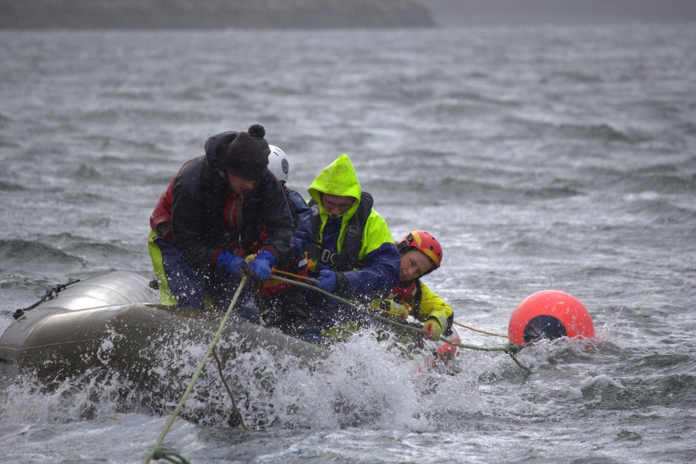Fishermen and BDMLR disentanglement team members practicing the ‘Nantucket Sleighride’, a technique originally developed by whalers and adapted to safely attach to and approach an entangled whale in order to disentangle it. Image credit: Scottish Entanglement Alliance (SEA) 2019.