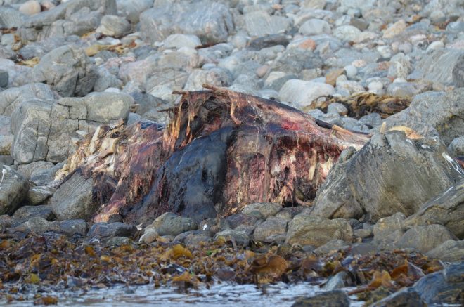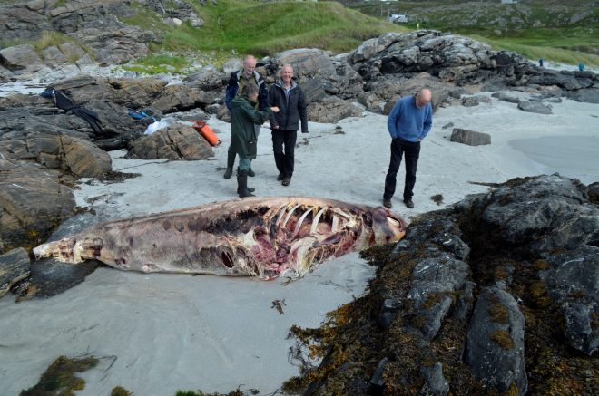 A badly decomposed Cuvier’s beaked whale on Tiree. Luckily most of the important parts of its skeleton and soft tissues critical for analysis still survive.