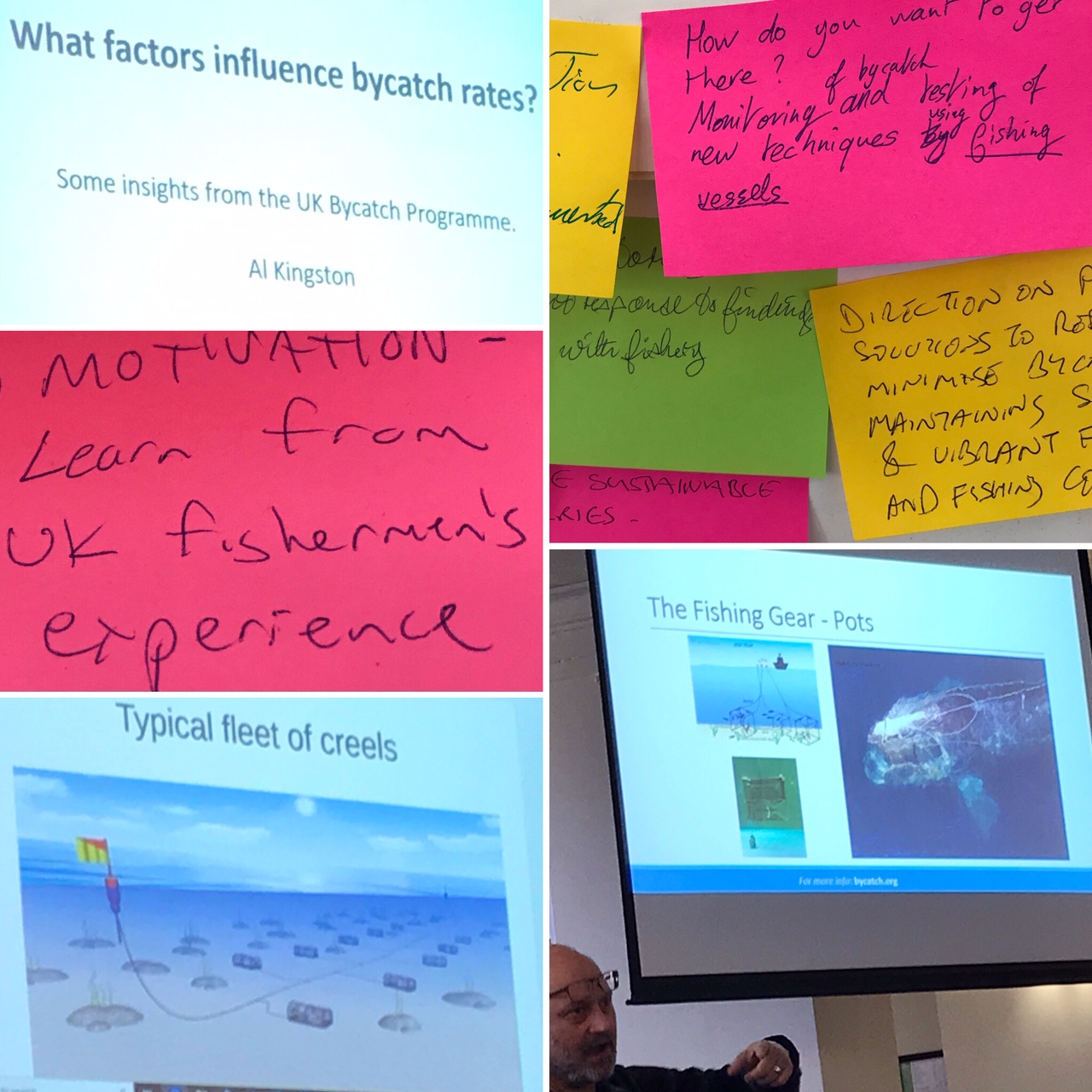 Presentations from the Scottish Fishermen’s Organisation and the Scottish Creel Fishermen’s Federation featured on day one, and covered topics including the importance of industry and stakeholder-led research and engagement. Methods of monitoring by-catch and entanglement using satellites, autonomous underwater vehicles, hydrophones, apps and other electronic methods were also discussed at length, as were possible mitigation measures using light, sounds, gear modifications and electric barriers. Animal biology and behaviours in relation to bycatch and entanglement, and work in challenging traditional fishing conventions were also hot topics. These in turn inspired some very meaningful and enlightening debates especially on day two, when attendees were split into their respective groups (fishers, researchers, policy makers etc.) to discuss the strengths, weaknesses, opportunities and threats as they perceived them, associated with each of the proposed bycatch and entanglement monitoring and mitigation options.