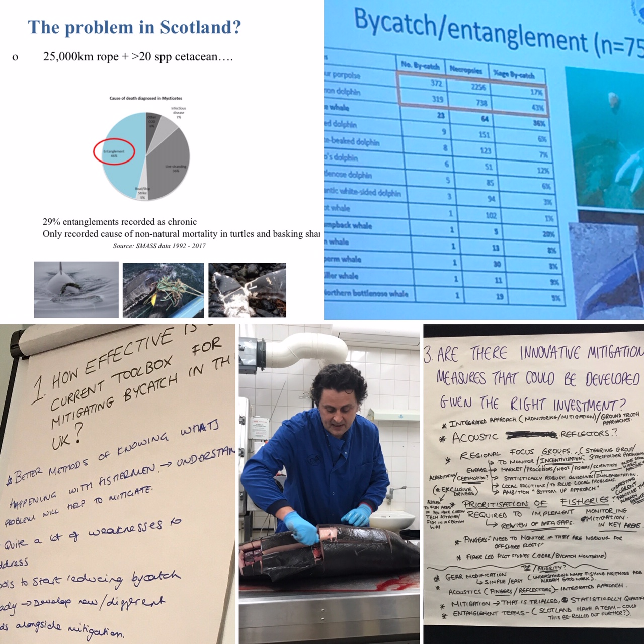 The event was summed up by one Scottish fisherman who commented that “We had two days of workshops, presentations and scientists from all over the world keen to engage with fishermen to find solutions to things like entanglements in nets and ropes. We learned loads, I think they did too, we even attended a by-caught porpoise necropsy…..It was a brilliant trip and experience. Some species are prone to get entangled in nets, others in ropes. There are a few species in the world that are critically endangered and there is some real urgency to find solutions and mitigations. Plenty work to be done, but the good news is that there is plenty that can be done…and we may even have come up with some good ideas!”