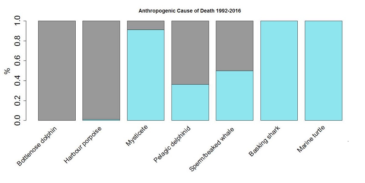 Since 1992 SEA partner the Scottish Marine Animal Stranding Scheme (SMASS) has performed almost 3000 necropsies to establish cause of death of marine animals found stranded around the Scottish coast. Overall, entanglements has been diagnosed as the cause of death in less than 2% of these cases, and for some species e.g. harbour porpoise and bottlenose dolphins, entanglement does not seem to pose a threat. However for Mysticetes (baleen whales including minke and humpback whales) entanglement accounts for 46% of known deaths in Scottish waters. For basking sharks and turtles, 100% of known human-caused deaths have been the result of entanglement.