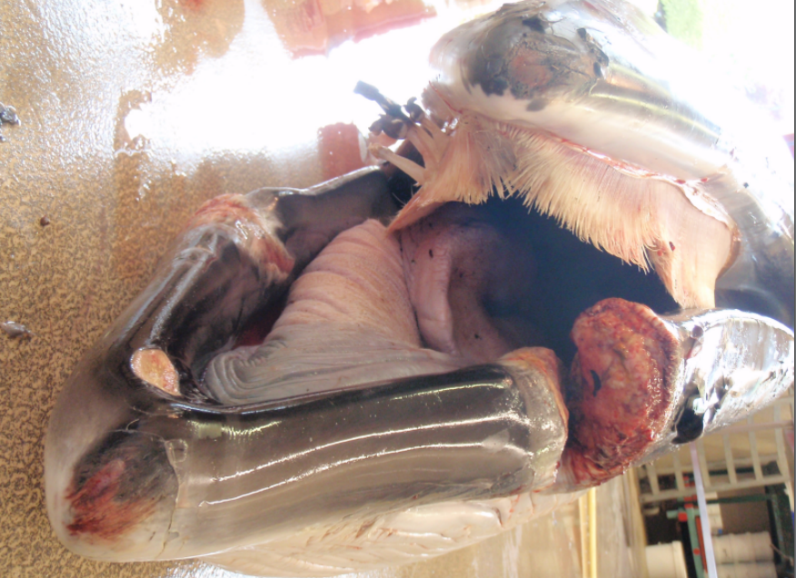 Chronic entanglement – this young male minke whale discovered on the west coast of Scotland suffered a debilitating chronic entanglement which resulted in deep tissue lacerations and a fractured jaw. This animal died of starvation and sepsis approximately six months after first becoming entangled.