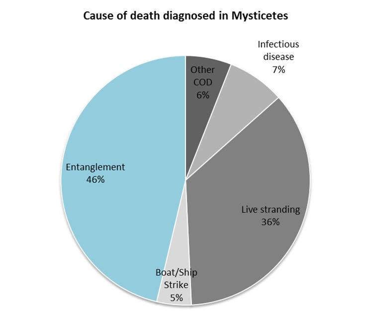 Cause of death diagnosed in Mysticetes in Scottish waters since 1992 (left), and anthropogenic (human-induced) causes of death in marine animals (right). SMASS 2018