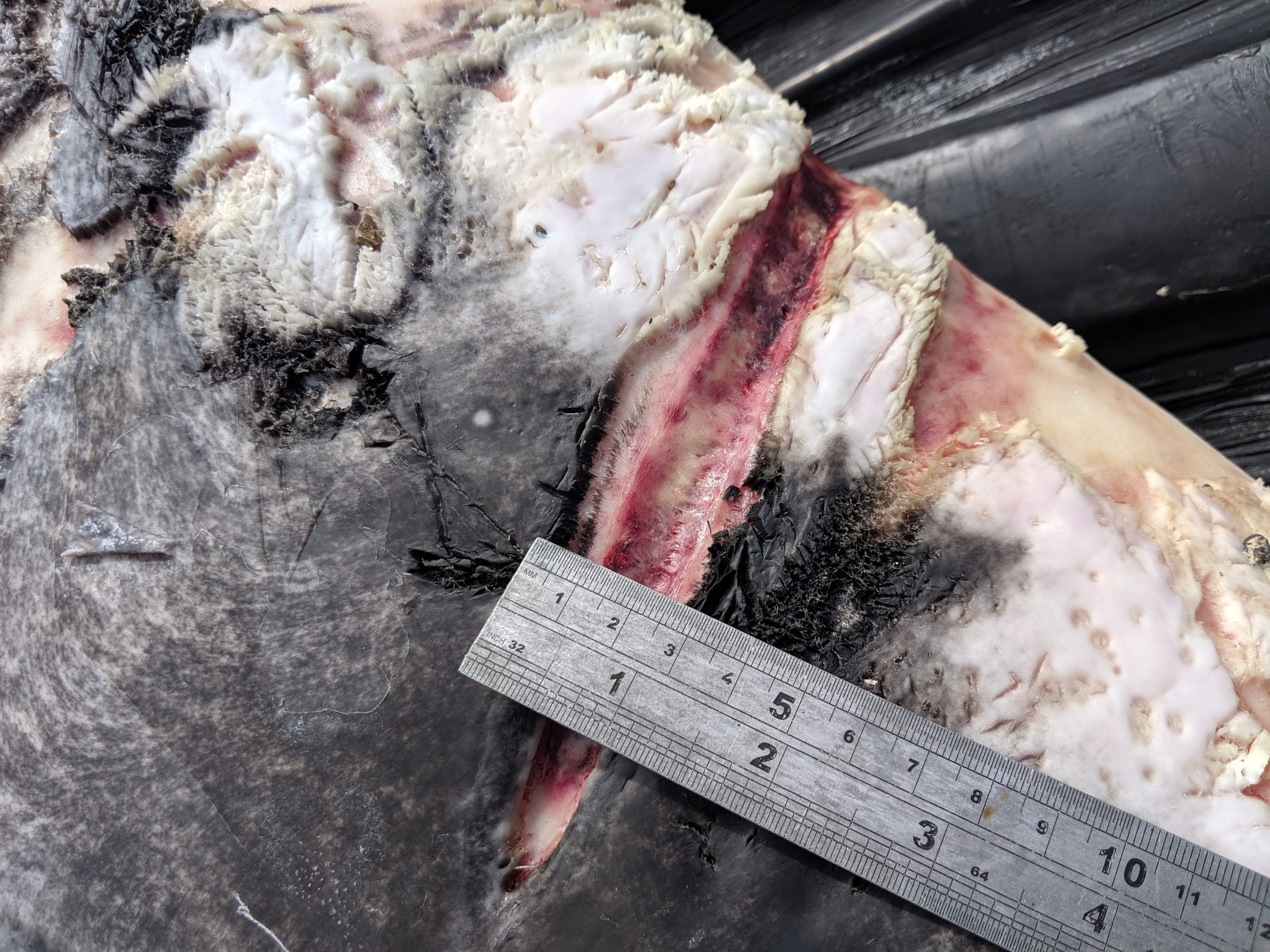 This case does raise some very interesting questions – the animal was in moderate to good body condition, had evidence that it had fed reasonably recently and, in contrast to the previous humpback we reported last month near Dunbar, did not show signs of long term debilitation. In addition, the wounds associated with the rope were reasonably recent, with limited scarring and tissue remodelling, and there were marks around the tailstock and fluke made by different ropes which were no longer attached to the animal. It’s possible therefore that this was a two-stage entanglement as the pattern of skin abrasions around the tailstock and fluke suggest the animal had also been acutely entangled, but these ropes which became detached or were removed prior to the animal stranding. But where did this animal first became entangled? Did it entrain gear in the waters off Nova Scotia and drag the buoy across the Atlantic, or was the buoy ‘ghost gear’ which drifted across the Atlantic and entangled the animal off the coast of Scotland? We suspect the latter is more plausible based on the pathology, and also it is unlikely that a young animal like this would swim between both sides of the Atlantic. We may never know but with the help of fishermen, researchers and volunteers from Scotland, Canada and the USA we have been able to better our understanding of entanglements and highlighted that marine debris and ghost gear are genuinely a global hazard, whose impact spans ocean basins, sometimes affecting marine life many thousands of miles from where originally deployed.