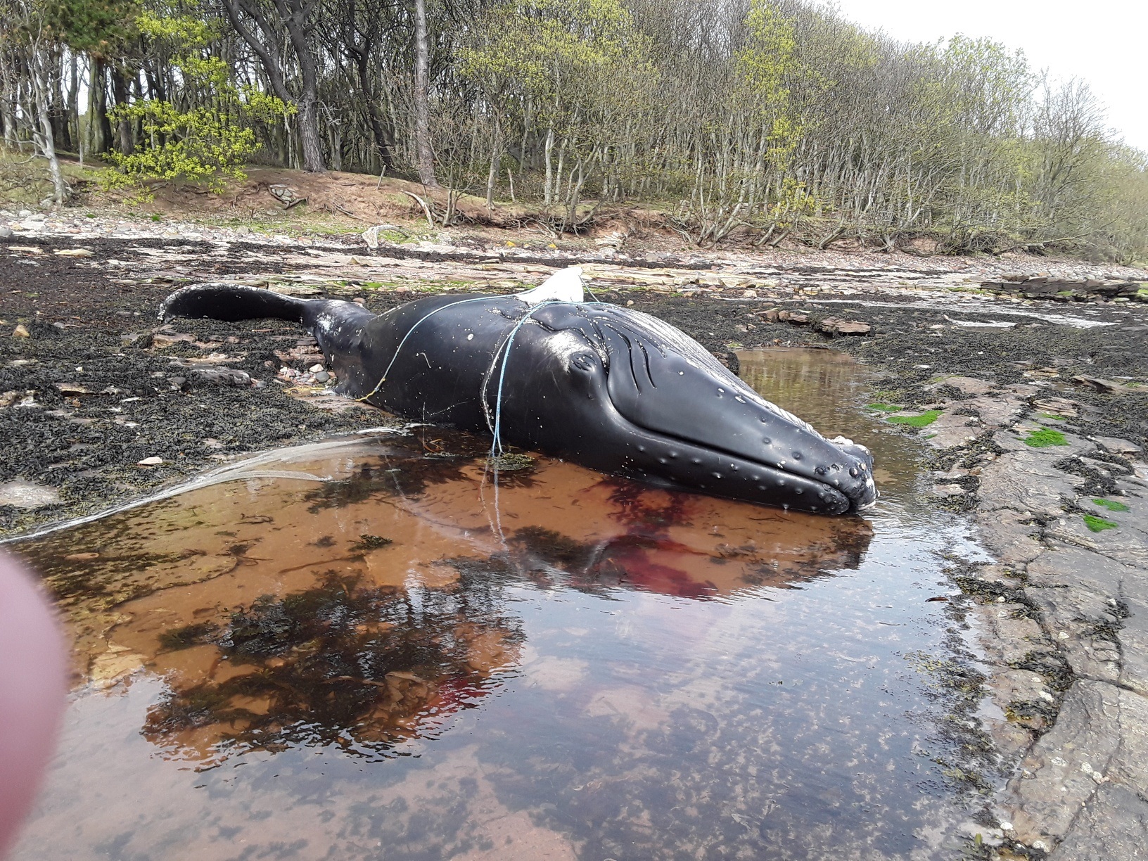 The humpback washed ashore at Tyninghame earler this week with entangling ropes still attached. Image credit: East Lothian Council Countryside Rangers