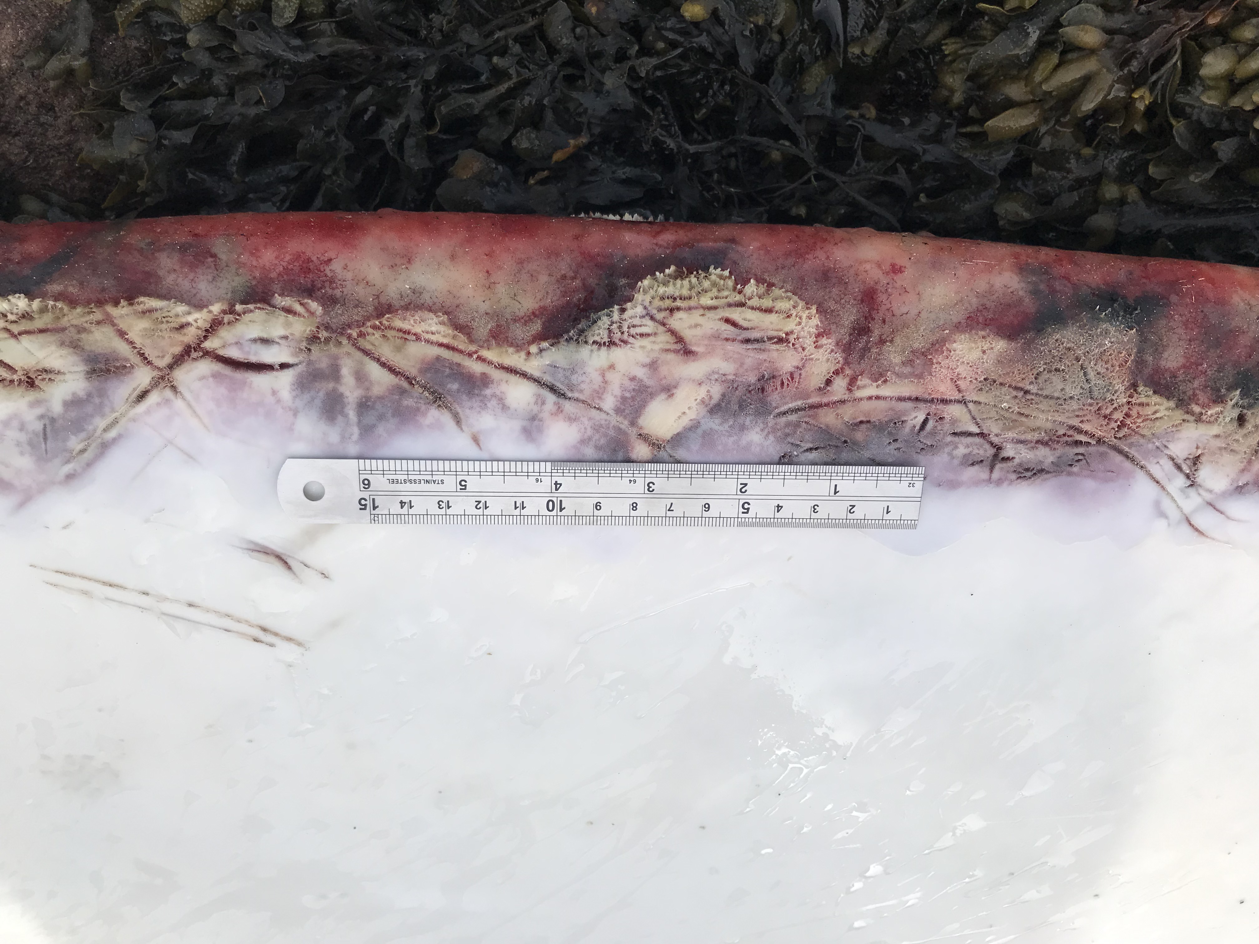Later that day the whale carcass was moved to Skateraw beach where the Scottish Marine Animal Stranding Scheme’s (SMASS) veterinary pathologist Dr Andrew Brownlow performed a necropsy. His findings are detailed here: