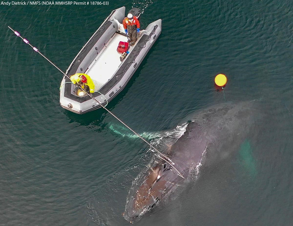 Drones have been used to support several successful disentanglements in Hawaii, California and this incident involving a humpback whale entangled in pot gear in Alaska. Image credit: Andy Dietrick.