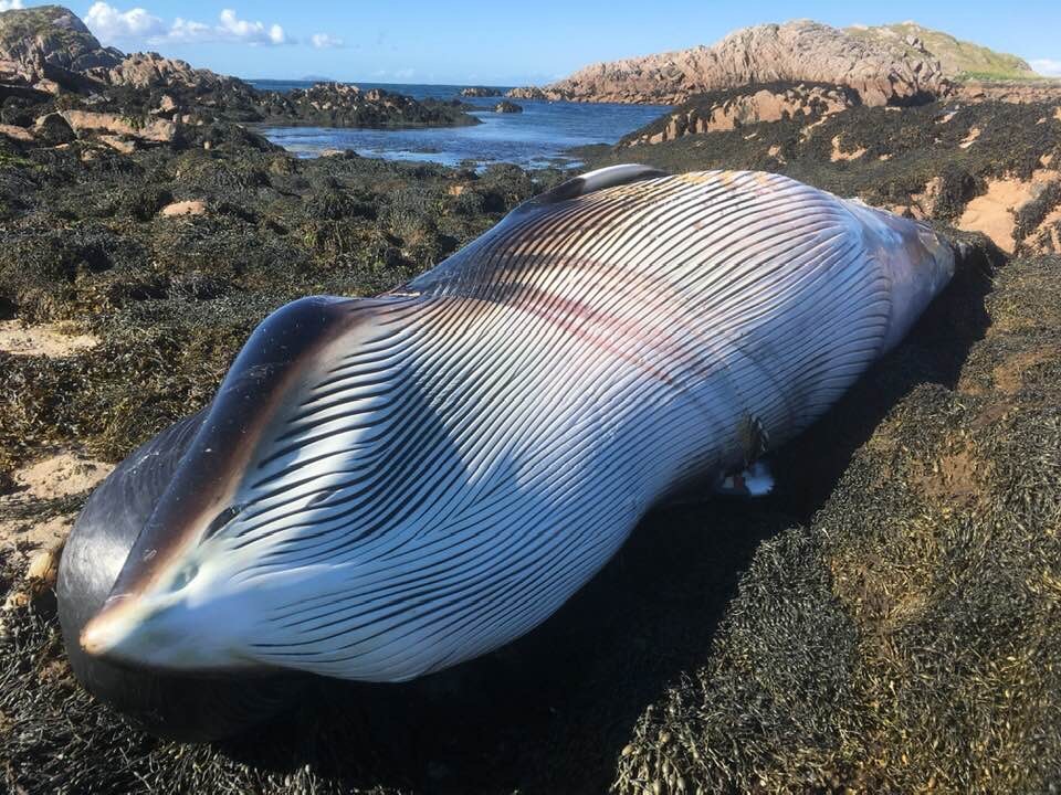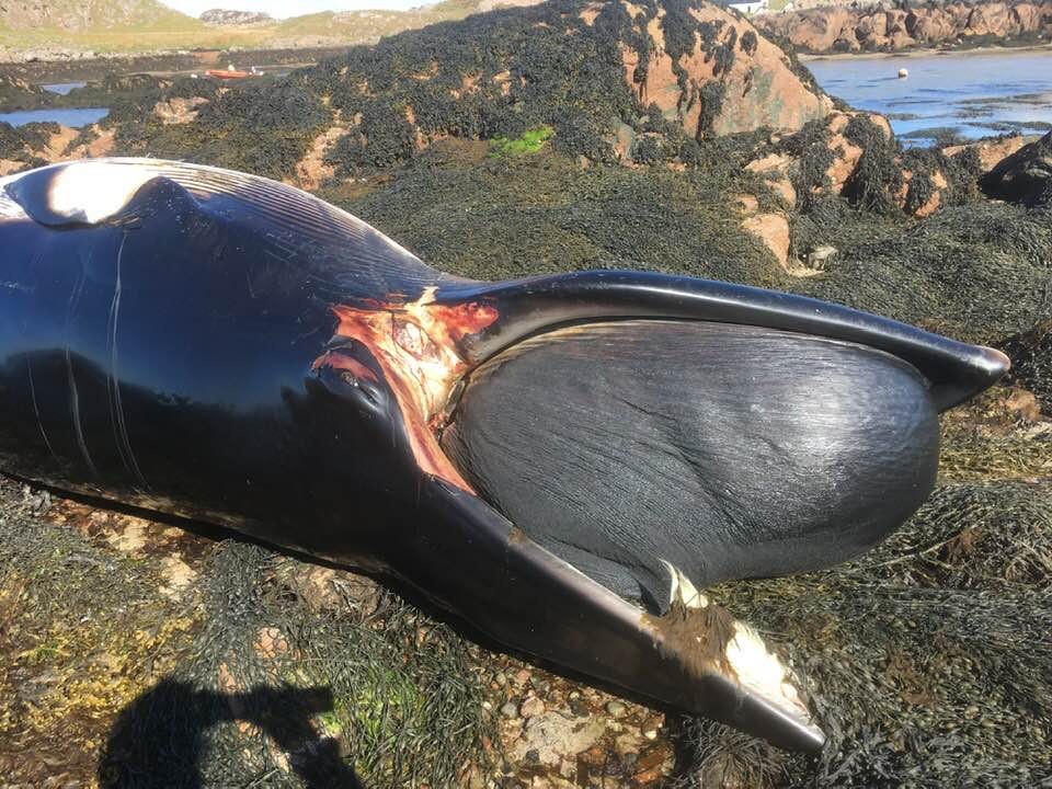 The minke whale has since washed ashore on Mull. Although the animal has been freed from the entangling gear, evidence of this is still visible on the carcass. Image credits: Hannah Elizabeth Fisher.
